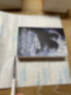 3. Pick a side, I like to do the front first, and “roll” it onto the paper. Start with the edge and lay it down in an arching rolling motion. This is so that you can ideally avoid air bubbles. However, it’s likely that you will see them. So simply flip the book over and peel the adhesive back and start at the edges, pressing it down. Work your way from one edge towards the spine. You want to avoid air bubbles, so work them out. Peel it up as many times as necessary if there are bubbles.